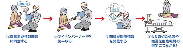 救急隊員が傷病者(患者)のマイナ保険証(健康保険証として利用登録したマイナンバーカード)を活用して、医療情報等を閲覧する仕組みです。